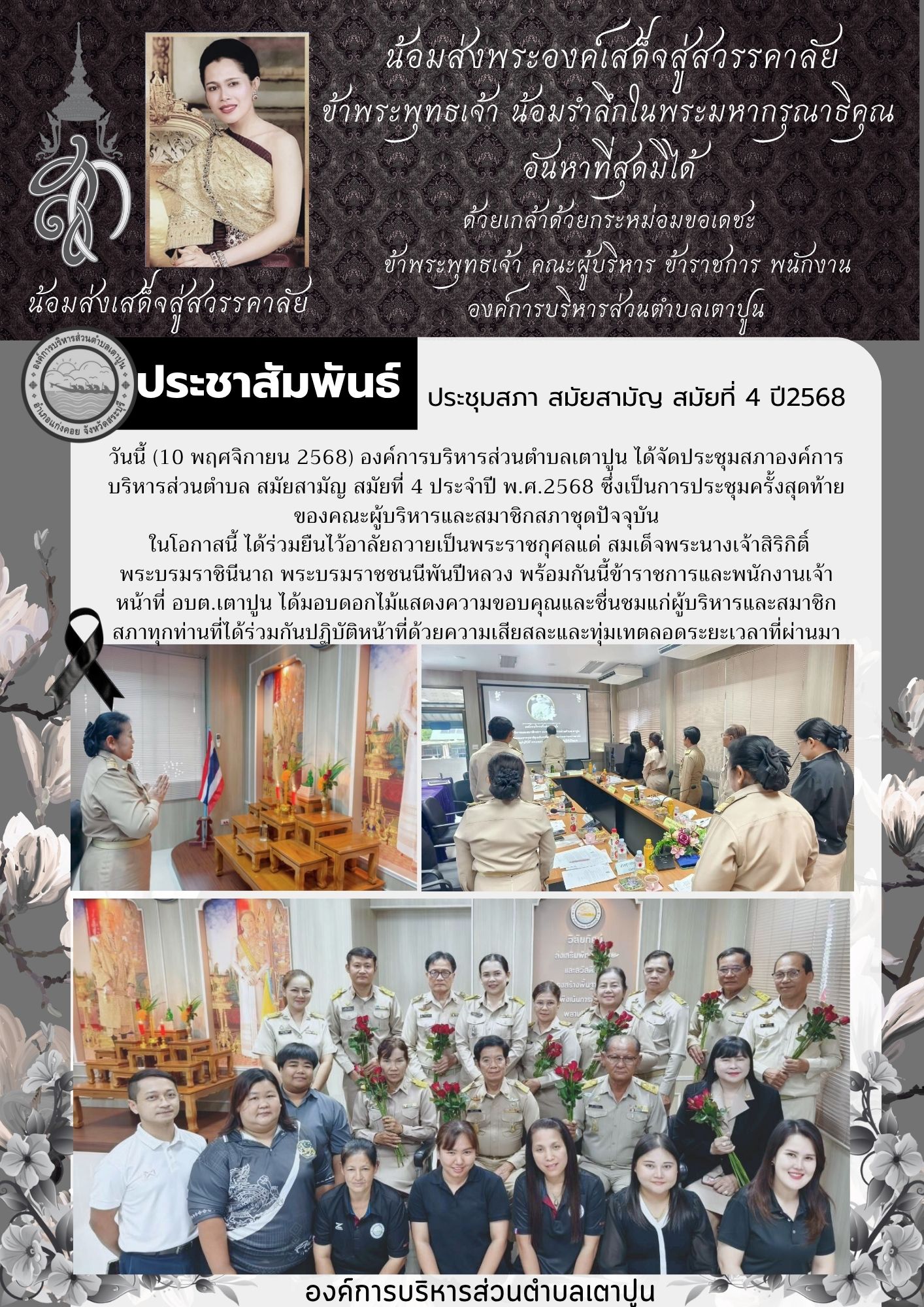 การประชุมครั้งนี้ เป็นการประชุม ครั้งสุดท้ายของคณะผู้บริหารและสมาชิกสภาชุดปัจจุบัน โดยมีการพิจารณาและติดตามผลการดำเนินงานในรอบปีงบประมาณ 2568 เพื่อสรุปผลการพัฒนาในด้านต่าง ๆ ของตำบลเตาปูน รวมทั้งรับฟังข้อเสนอแนะจากสมาชิกสภาและส่วนราชการในพื้นที่ เพื่อนำไปใช้เป็นแนวทางในการพัฒนาและปรับปรุงการบริหารงานท้องถิ่นให้มีประสิทธิภาพมากยิ่งขึ้น